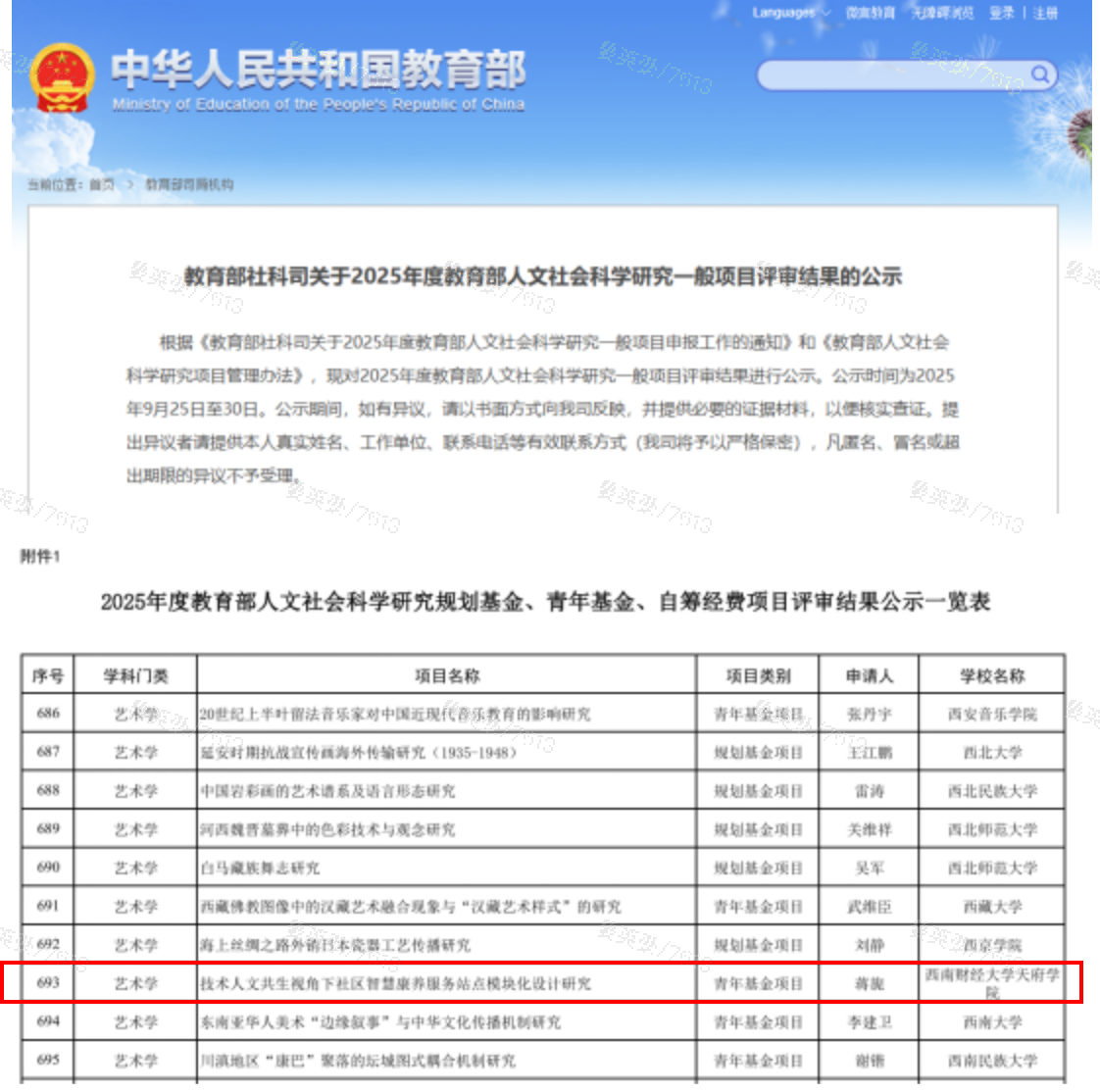 近日,教育部社会科学司正式公布“2025年度教育部人文社会科学研究一般项目”评审结果。西南财经大学天府学院艺术与传媒学院蒋旎老师主持申报的《技术人文共生视角下社区智慧康养服务站点模块化设计研究》课题,经多轮严格评审,成功获批青年基金项目。此为学校首次在该类别项目中获得立项,达成了部级项目“零的突破”,彰显了学校人文社科领域科研实力与青年教师学术水平提升至新高度。