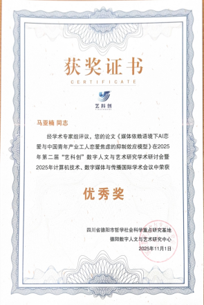 11月1日,艺术与传媒学院媒体与传播系银龄教师钟克勋教授指导青年教师马亚楠完成的学术论文《媒体依赖语境下AI恋爱与中国青年产业工人恋爱焦虑的抑制效应模型》在第二届“艺科创”数字人文与艺术研究学术研讨会暨2025年计算机技术、数字媒体与传播国际学术会议上获奖。这一成果标志着系部在推动科研创新、促进青年教师成长方面取得了实质性进展,也是系部师资队伍建设和学术传承的生动体现。