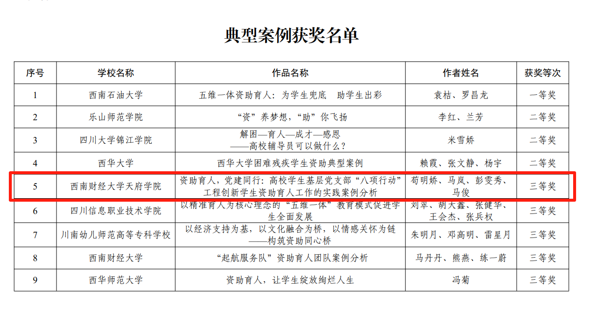 在四川省首届高校学生资助工作优秀论文典型案例评选中,由苟明娇、马岚、彭雯秀、马俊共同完成的案例《资助育人,党建同行:高校学生基层党支部“八项行动”工程创新学生资助育人工作的实践案例分析》荣获三等奖。该案例以“资助育人,党建同行”为核心理念,构建“学、谈、践、带、研、创、服、评”八维一体的资助育人体系,通过精准识别困难学生,系统开展学业帮扶、心理关怀、社会实践等多元行动,有效提升了学生的综合素质与发展能力。该模式以学生基层党支部为组织载体,将党建与育人深度融合,形成了党建引领下可复制、可推广的资助育人新路径,为资助工作提供了具有参考价值的实践范例。