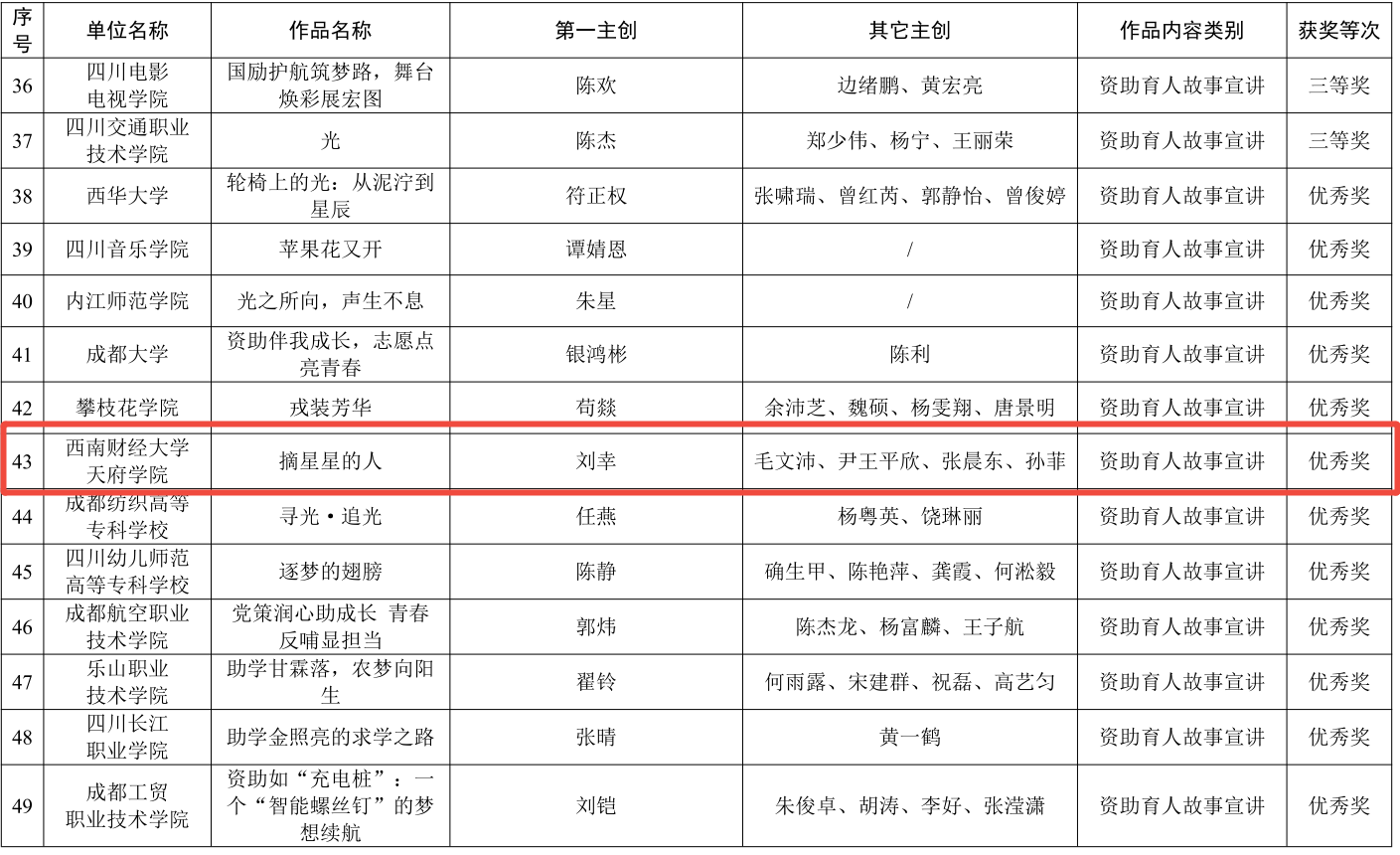 在四川省第四届“感恩资助心向党 政策宣传我来讲”微视频征集展播活动中,由辅导员刘幸指导,学生毛文沛、尹王平欣、张晨东、孙菲共同创作的作品《摘星星的人》获优秀奖。作品以西部计划志愿者毛文沛的真实经历为原型,通过“星空-征途-传承”三段式叙事,生动呈现了国家资助政策如何帮助学子从受助者成长为奉献者,传递出感恩与责任的青春力量。视频以细腻的镜头语言和真实的情感表达,展现了受助学生在国家政策支持下成长成才、最终选择扎根西部、回馈社会的动人故事,具有较强的思想感染力和传播价值。