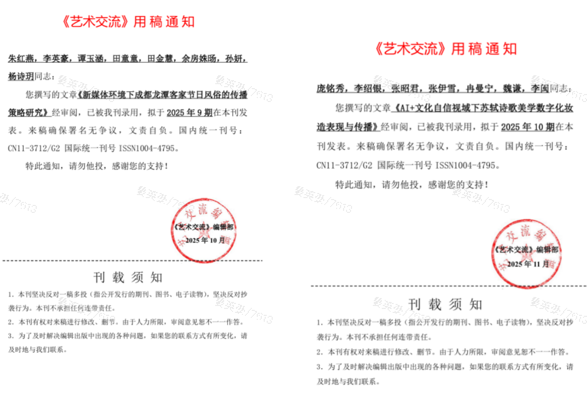 2025年10月以来,余房姝旸老师指导的多项学生研究项目陆续发表成果,其中,指导朱红燕、李英豪等同学完成的论文《新媒体环境下成都龙潭客家节日风俗的传播策略研究》;与指导庞铭秀、李绍银等同学撰写的论文《AI+文化自信视域下苏轼诗歌美学数字化妆造表现与传播》也已经被《艺术交流》杂志录用,将分别于2025年第9期、第10期发表。