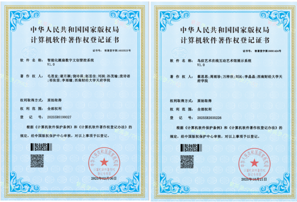2025年2月和10月,毛思宜等同学和蔡思思等同学在刘丽娟老师的指导下,分别成功软著《智能化潮扇数字文创管控系统V1.0》和《鸟纹艺术在线互动艺术馆展示系统V1.0》在技术应用与成果转化方面取得了突破,展现了环境设计专业在文化数字空间构建、交互系统开发等方面的创新能力。