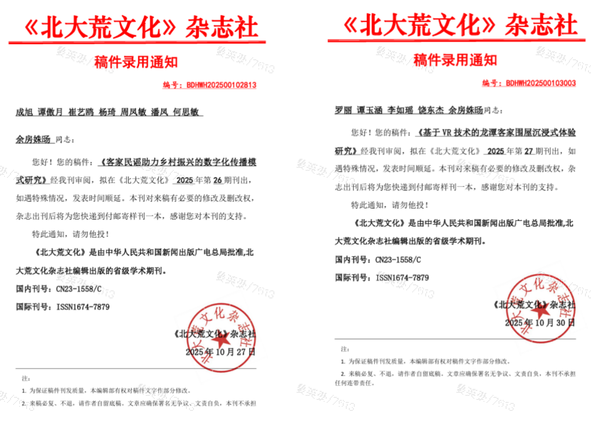 余房姝旸老师与何思敏老师共同指导成旭、谭傲月等同学撰写的论文《客家民谣助力乡村振兴的数字化传播模式研究》,与饶东杰老师共同指导罗丽、谭玉涵等同学完成的论文《基于VR技术的龙潭客家围屋沉浸式体验研究》均已被《北大荒文化》杂志社录用,分别将于2025年第26期、27期刊出。