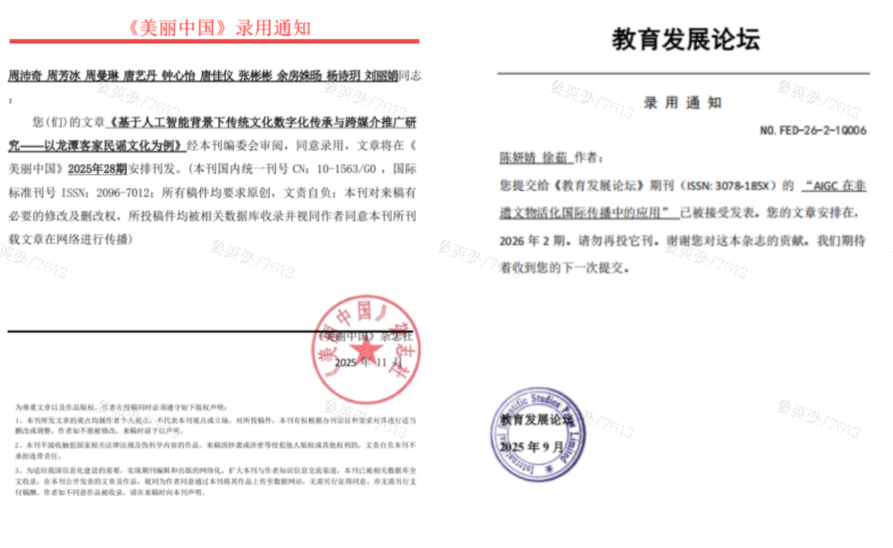 余房姝旸老师与刘丽娟老师共同指导周沛奇、周芳冰等同学撰写的《基于人工智能背景下传统文化数字化传承与跨媒介推广研究——以龙潭客家民谣文化为例》也已经被《美丽中国》杂志社录用,将于2025年第28期刊发。