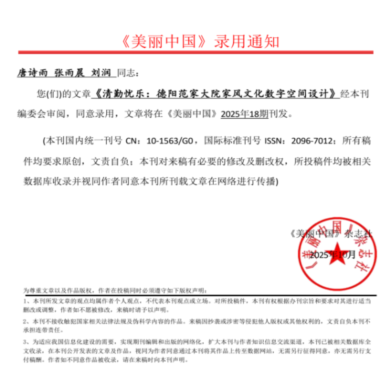 刘丽娟老师持续指导环境设计专业学生开展传统文化数字化研究,早在于2024年就已经指导学生钱橙完成论文《基于体感互动技术的成都小通巷历史街区文化数字地图科普应用》并发表于《前沿科学》杂志2024年第9期,指导学生毛思宜完成论文《德阳潮扇文化数字展示路径研究》成功发表于《文化时代》杂志2024年第27期。2025年10月,又指导学生唐诗雨等完成的论文《清勤忧乐:德阳范家大院家风文化数字空间设计》现已经成功被期刊《美丽中国》录用,将于2025年第18期发表。