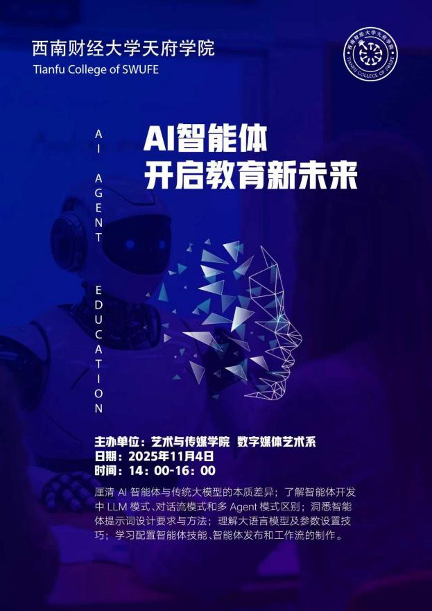 为深入推进教学改革,探索人工智能技术与教育教学的深度融合,西南财经大学天府学院艺术与传媒学院于11月4日成功举办了“人工智能教育教学改革:AI Agent智能体开放工作坊”的专题培训。本次培训内容由学院数字媒体艺术系组建的专项研究团队历时三个月潜心研发完成,旨在赋能我院教师掌握前沿技术工具,将教学改革理念转化为可落地、可操作的智能化解决方案。