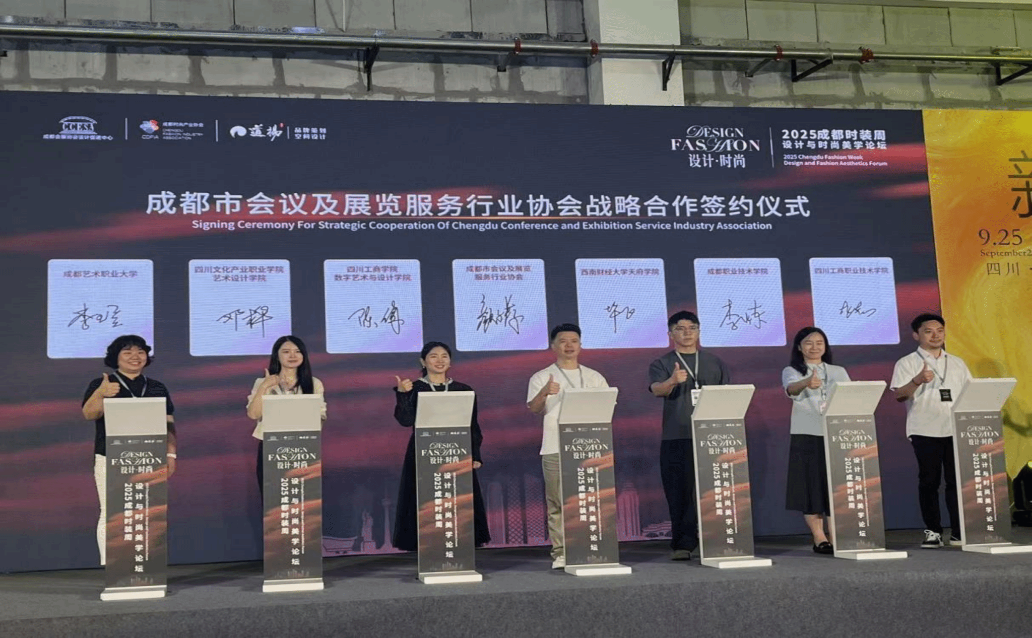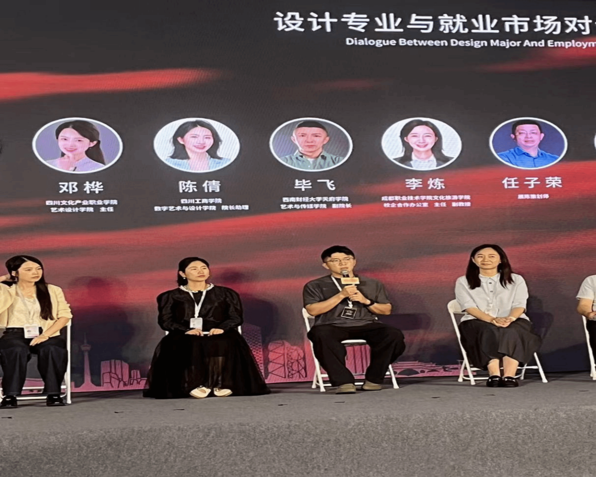 论坛期间,毕飞应主办方邀请,参与了高端对话环节。他就设计专业的未来发展趋势、学生就业前景以及深化产教融合等关键问题发表了深刻见解。在与会嘉宾与师生的共同见证下,毕飞代表西南财经大学天府学院艺术与传媒学院,与成都市会议及展览服务行业协会签署了战略合作协议。