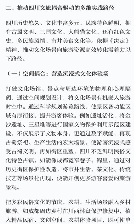 文章围绕新时代背景下文化与旅游深度融合的发展路径展开系统研究,从“空间耦合、业态耦合、技术耦合、政策与服务耦合”四个维度,构建了文化场景向旅游效益转化的理论框架,并结合三星堆、宽窄巷子、川西林盘等四川典型文化案例,提出具有现实操作性的融合路径与传播策略。