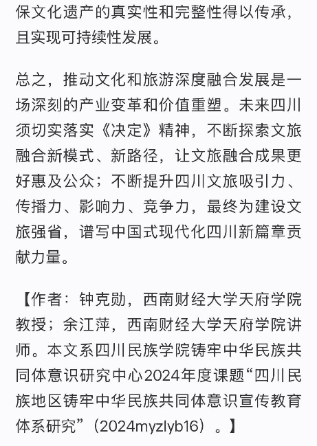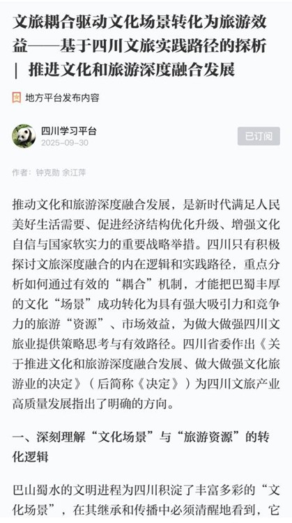 近日,艺术与传媒学院媒体与传播系银龄教师钟克勋教授与系主任余江萍合作撰写的理论文章《文旅耦合驱动文化场景转化为旅游效益 —— 基于四川文旅实践路径的探析》,在 “学习强国”平台正式发表。文章紧扣新时代文旅深度融合发展需求,立足四川丰富的文化与旅游资源实践,旨在为破解 “文化场景向旅游效益转化” 难题、助力四川文旅高质量发展贡献专业传播智慧与理论支撑。