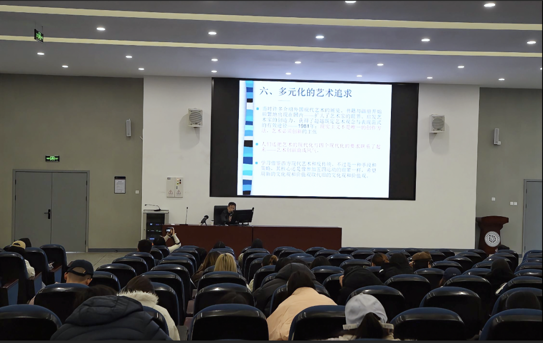 讲座伊始,鲁虹教授以时间为轴,系统梳理了中国美术自改革开放前后的发展脉络,详细解析了不同阶段的艺术生态。他从 20 世纪 90 年代的架上艺术多元探索切入,系统梳理了新生代艺术对日常生活的聚焦、波普艺术对商业符号的挪用、女性艺术视角的自觉与表达,进而延伸至另类艺术的实验性探索、民间艺术平台的兴起,以及全球化与新媒体技术为艺术生态带来的深刻变革。此外,鲁虹教授还进一步阐述了装置、影像等艺术形式在中西融合中的发展路径,并探讨了当代艺术“再中国化”的创作内核。