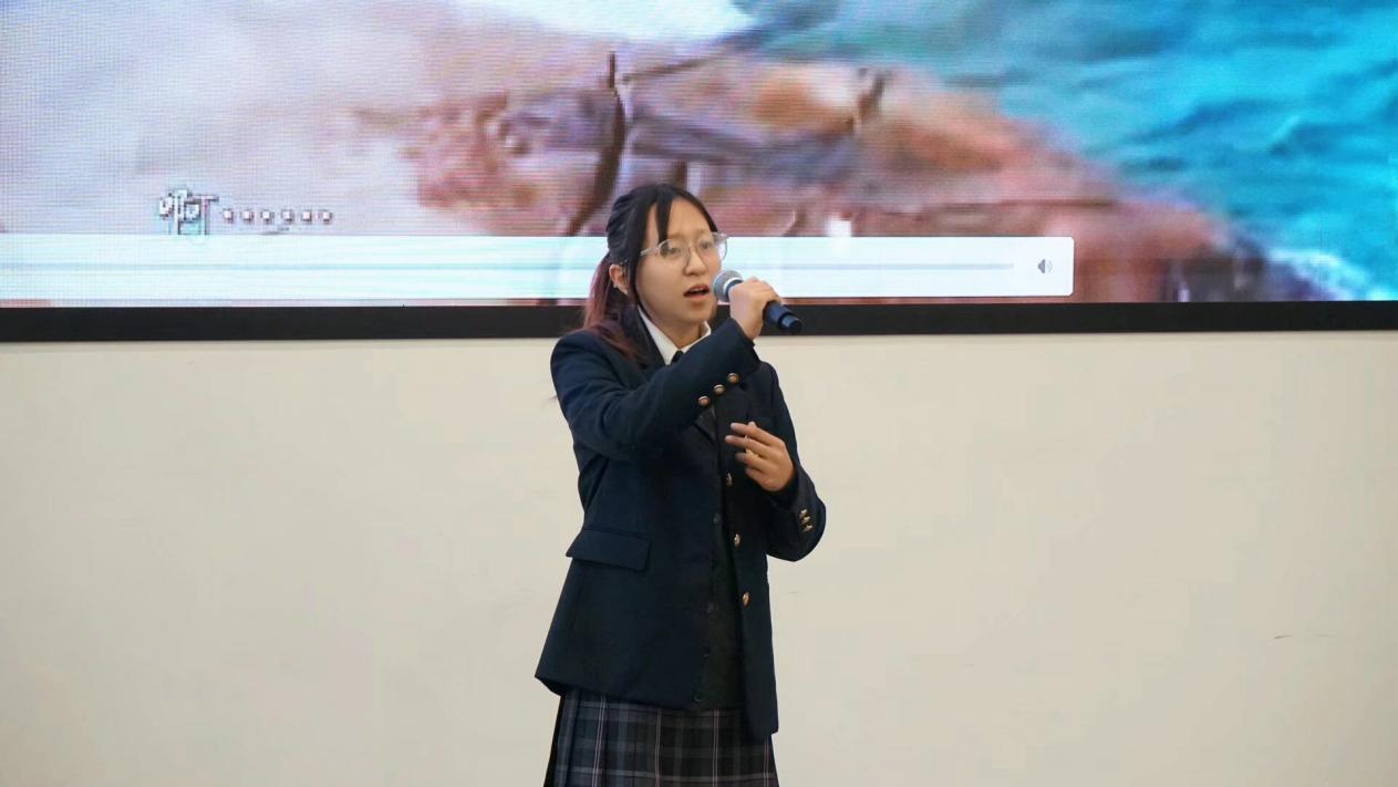 尾声之际,2024级网新04班周丽颖同学以一曲《浮光》登场,用歌声向“一二·九”精神致以青春的礼赞。她巧妙地借“光”为喻,让历史的追寻与当代的担当在旋律中交汇。其演唱深情而富有张力,旋律流转间,既有对往昔峥嵘的深沉凝望,更蕴含着未来已来、我辈接力的坚定信念。歌声落下,悠长的共鸣仍在场内回荡。
