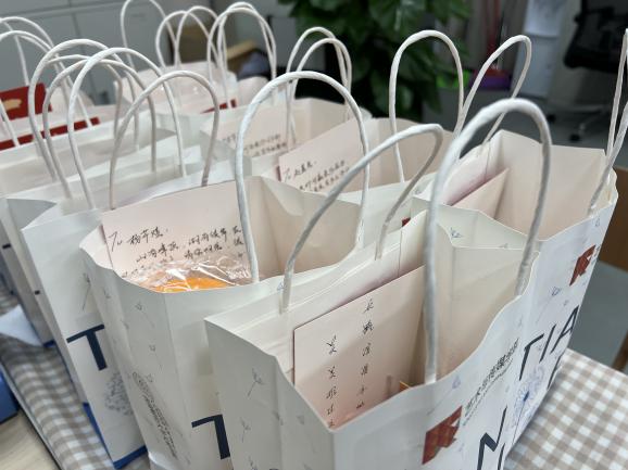 为向考研学子传递更具温度的关怀,学院学生第四党支部精心策划并准备了系列寓意深远的暖心礼品。针对同学们长期备考的辛劳,支部特别准备了象征“心想事成”的橙子、刻有励志箴言的“未来可期”定制书签、标注关键时间节点的“如你所愿”规划台历,以及印有“一战上岸”字样的鼓励徽章。此外,每位辅导员还亲笔为学子写下专属祝福信,字里行间承载着殷切的期望与坚定的支持,让每一份礼物都成为陪伴他们冲刺路上的温暖力量。