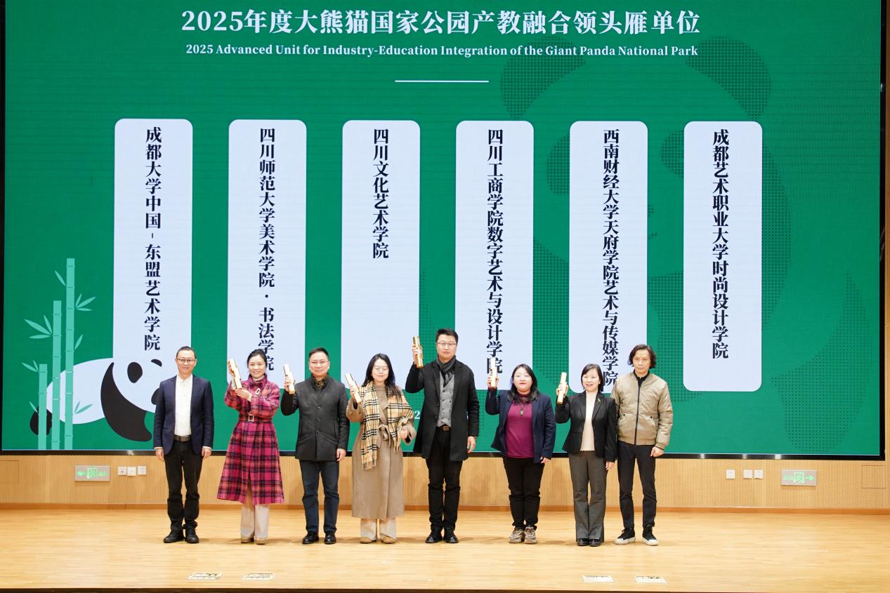 值得一提的是,我校艺术与传媒学院在此次大会中脱颖而出被授予2025年度大熊猫国家公园产教融“领头雁”单位。与多所高校相关学院一同获此殊荣。五粮液集团环球集团党委书记、董事长刘兴,四川省平面设计师协会秘书长傅冰为获奖单位颁奖。