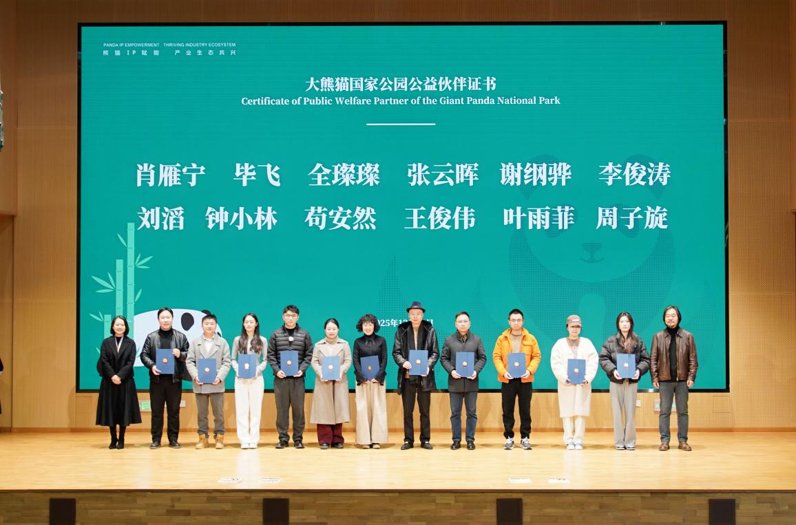 同时,我院大熊猫文化创意产业学院院长毕飞获得“大熊猫国家公园公益巡讲公益伙伴”称号。基地花花、熊猫经济50人论坛、熊猫家园・大熊猫文化创意大赛、RUARUAPANDA脱颖而出,获评年度大熊猫超级IP。