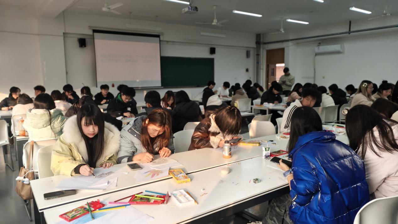 实践创作环节成为本次活动的重要部分。在魏世东老师的指导下,参与者伴随着不同风格的音乐,运用彩铅进行自由创作,借助色彩与线条的组合,表达内在情绪。过程中,成司霖老师则从心理学视角进行全程观察与记录,并通过即时互动技术,协助参与者缓解压力、探索自我。大家沉浸于艺术创作的氛围中,或凝神构思,或执笔创作,在视觉与听觉的双重浸润中,完成了各具特色的情绪表达作品。