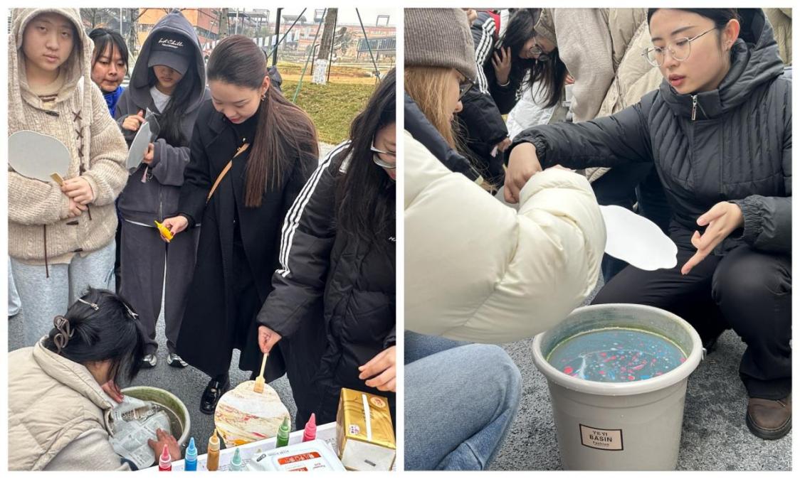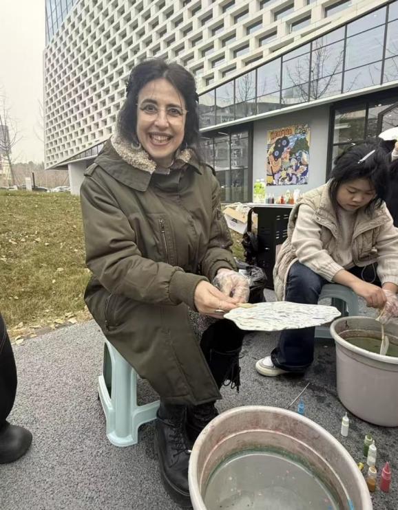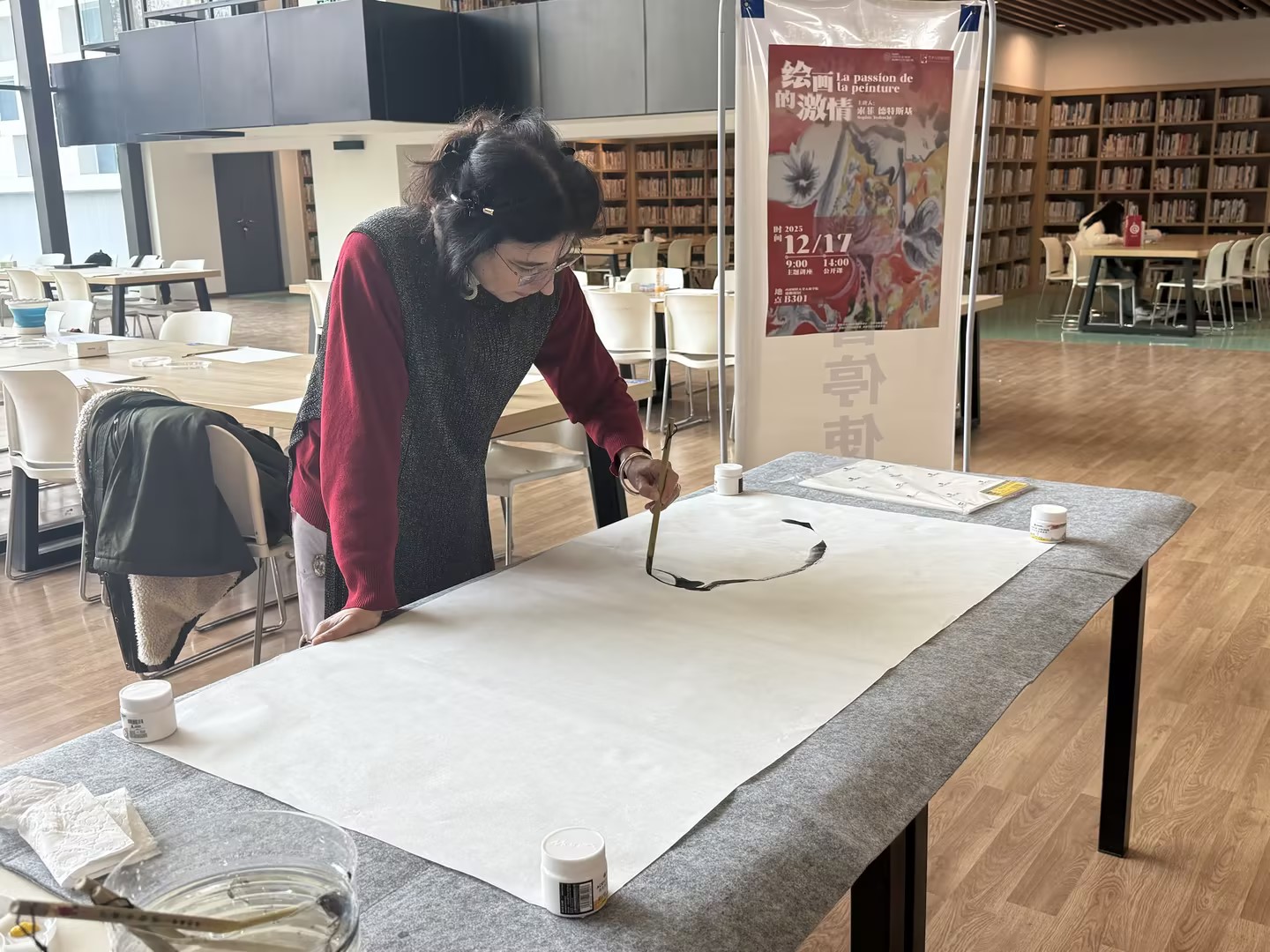 陶艺区里,魏长武老师耐心引导,对塑形手法的调整均给予一对一细致指导;参与者亲手进行揉泥、塑形等工序,反复揉捏使泥料均匀柔软,再通过捏塑、按压等手法塑造出憨态可掬的小动物、简约雅致的杯碟或充满想象力的抽象摆件,切实感受指尖触碰粘土时的温润触感,以及亲手赋予无定形材料以独特形态的创作乐趣。当参与者完成作品,审视亲手打造的专属陶艺成果,看着原本松散的粘土在自己手中逐渐成型、焕发生机,内心的满足与成就感油然而生。来自法国的艺术家索菲德特斯基在图书馆为同学们展示了用毛笔进行抽象绘画创作,也兴致盎然地体验了中国水墨漆扇的创意乐趣。