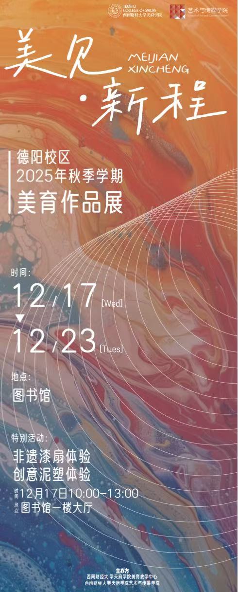 2025年12月17日,西南财经大学天府学院于德阳校区成功举办“美见・新程——2025美育作品展与手工工坊”活动。该活动为全校师生及艺术爱好者呈现出一场内容丰盛、形式多元的美育展览与体验活动。