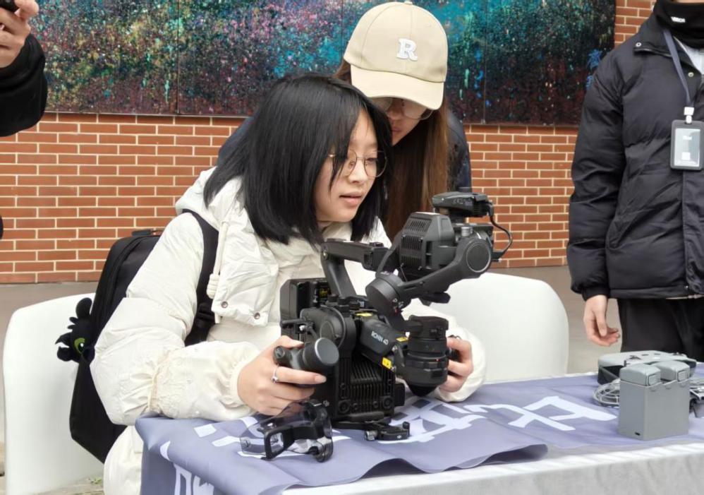 为进一步增强互动性与体验感,分享会特别设置了专业设备体验环节。学生在老师指导下操作专业摄影机、无人机等影视器材,在沉浸式互动中直观感受行业技术脉搏,现场气氛热烈。