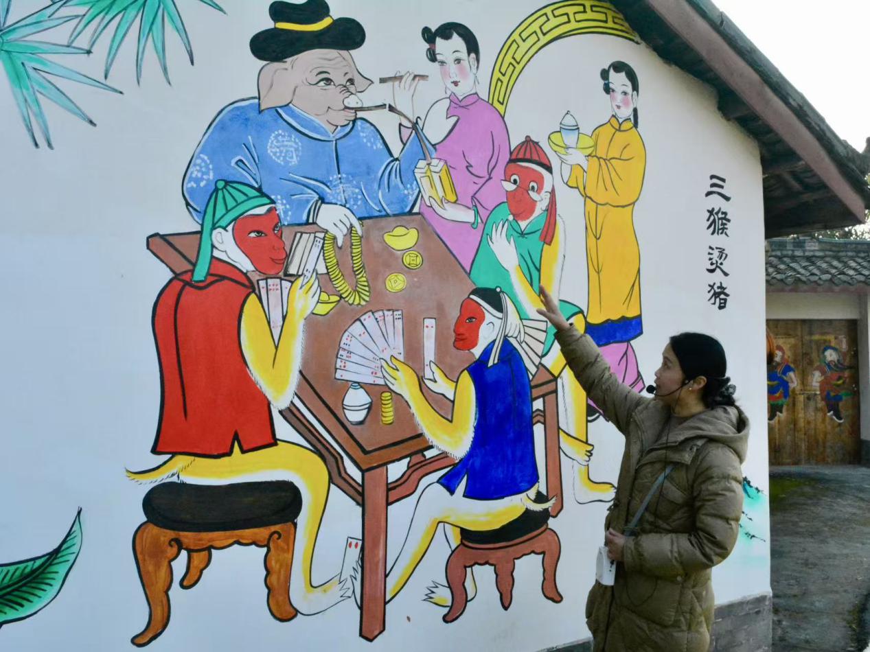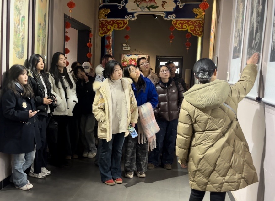 活动伊始,讲解人员何花带领同学们先后走进绵竹年画展示馆与年画村核心区域。在展示馆内,何花围绕绵竹年画的历史渊源、题材类型、制作工艺等核心内容进行细致解读,展区陈列的各类年画作品直观呈现了这门国家级非遗的艺术特色与文化内涵,帮助同学们构建起对年画艺术的系统认知。随后,同学们漫步年画村,家家户户房檐门墙绘满特色年画,专属长廊被各式作品装点,浓郁的非遗氛围让大家近距离领略了绵竹年画的独特魅力,进一步深化了对传统民间艺术传承与发展的思考。