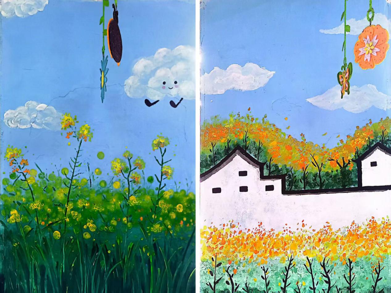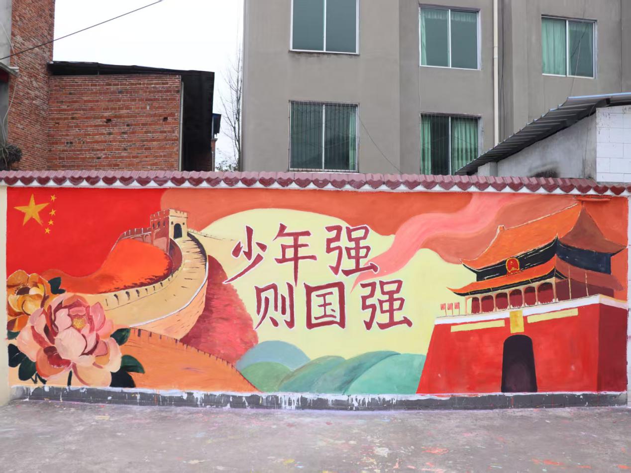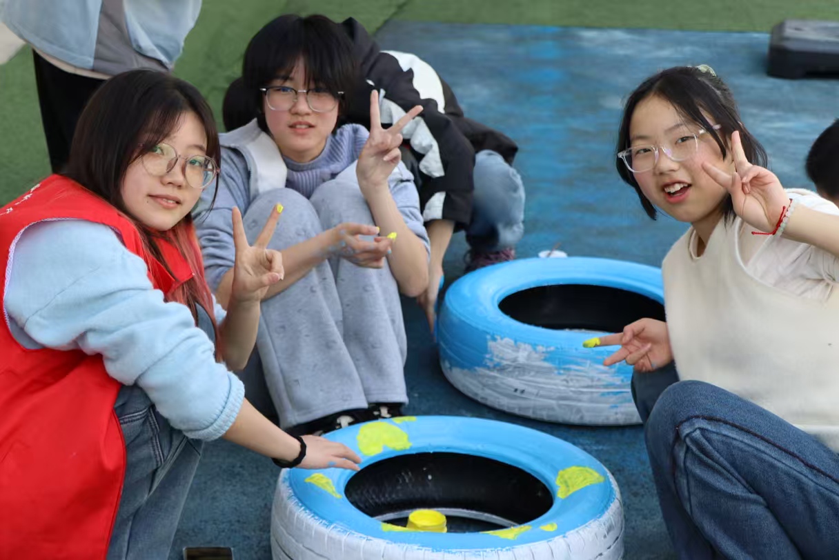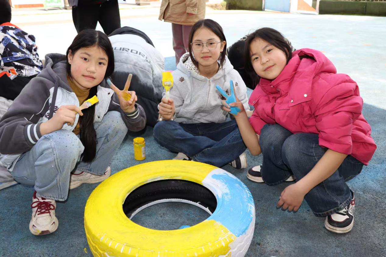在校园文化建设实践中,团队与学校共同开展校园墙绘创作。围绕“少年强则国强”“油菜花海”“童趣梦想”等主题,志愿者在前期设计构思的基础上进行整体绘制,并结合校园空间环境进行艺术化呈现,使原本单调的墙面形成具有教育意义与审美价值的校园文化景观,在美化校园环境的同时,也让美育与正能量浸润每一处角落。与此同时,团队还将美育实践延伸至废旧物品改造领域,组织学生开展废旧轮胎彩绘活动。大家以创意为笔,将原本闲置的轮胎变废为宝,打造成富有童趣与艺术气息的景观装置。这一过程不仅锻炼了学生的动手能力与想象力,也在潜移默化中传递了绿色环保理念,让生态意识与审美素养在孩子们心中生根发芽。