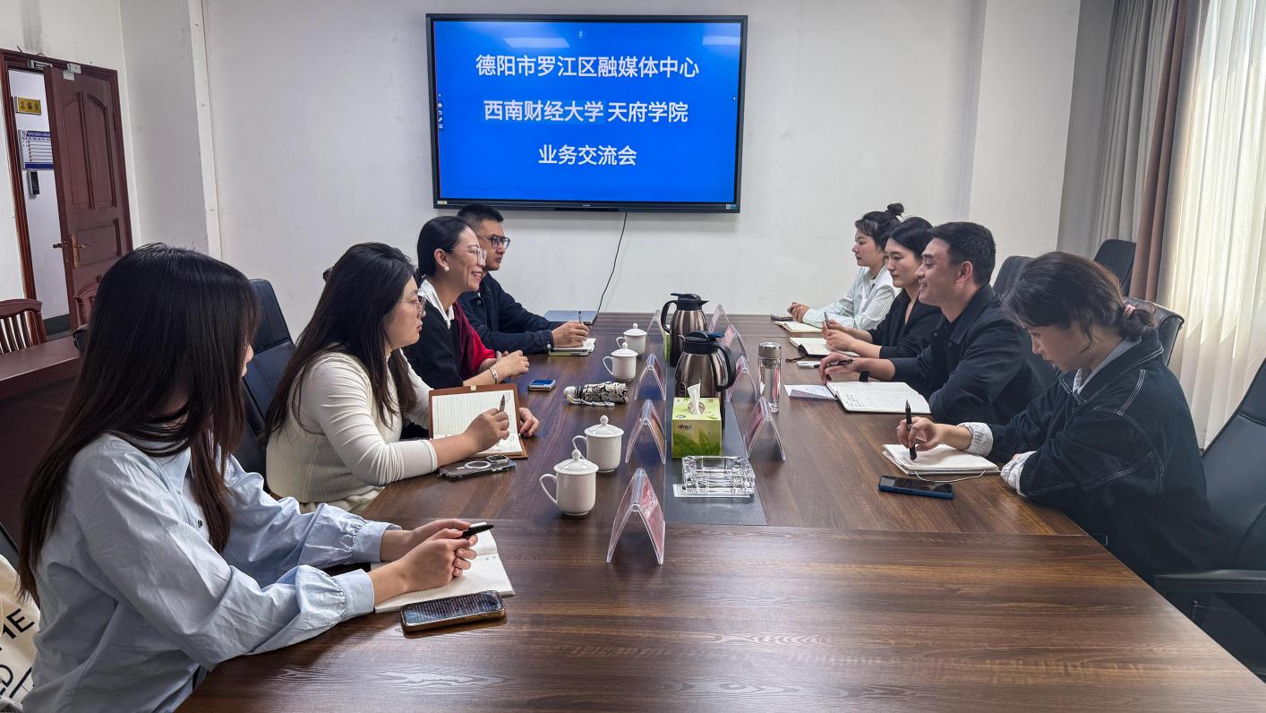 4月14日,西南财经大学天府学院党委办公室副主任、校团委副书记车学文、艺术与传媒学院副院长曲雅萍以及媒体与传播系骨干教师一行,前往罗江区融媒体中心开展合作洽谈。罗江区融媒体中心副主任杜洋洪主持会议并作主要对接。