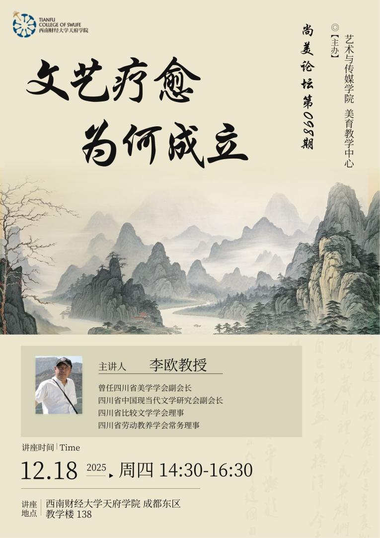 在快节奏、高压力的当代社会,艺术与文学正日益成为人们心灵的栖息地。文艺何以疗愈?它如何介入我们的精神世界,带来内在的平静与成长?为深入探讨这一议题,西南财经大学天府学院艺术与传媒学院、美育教学中心诚邀著名美育学者李欧教授,做客尚美论坛第098期,带来题为《文艺疗愈为何成立》的专题讲座。