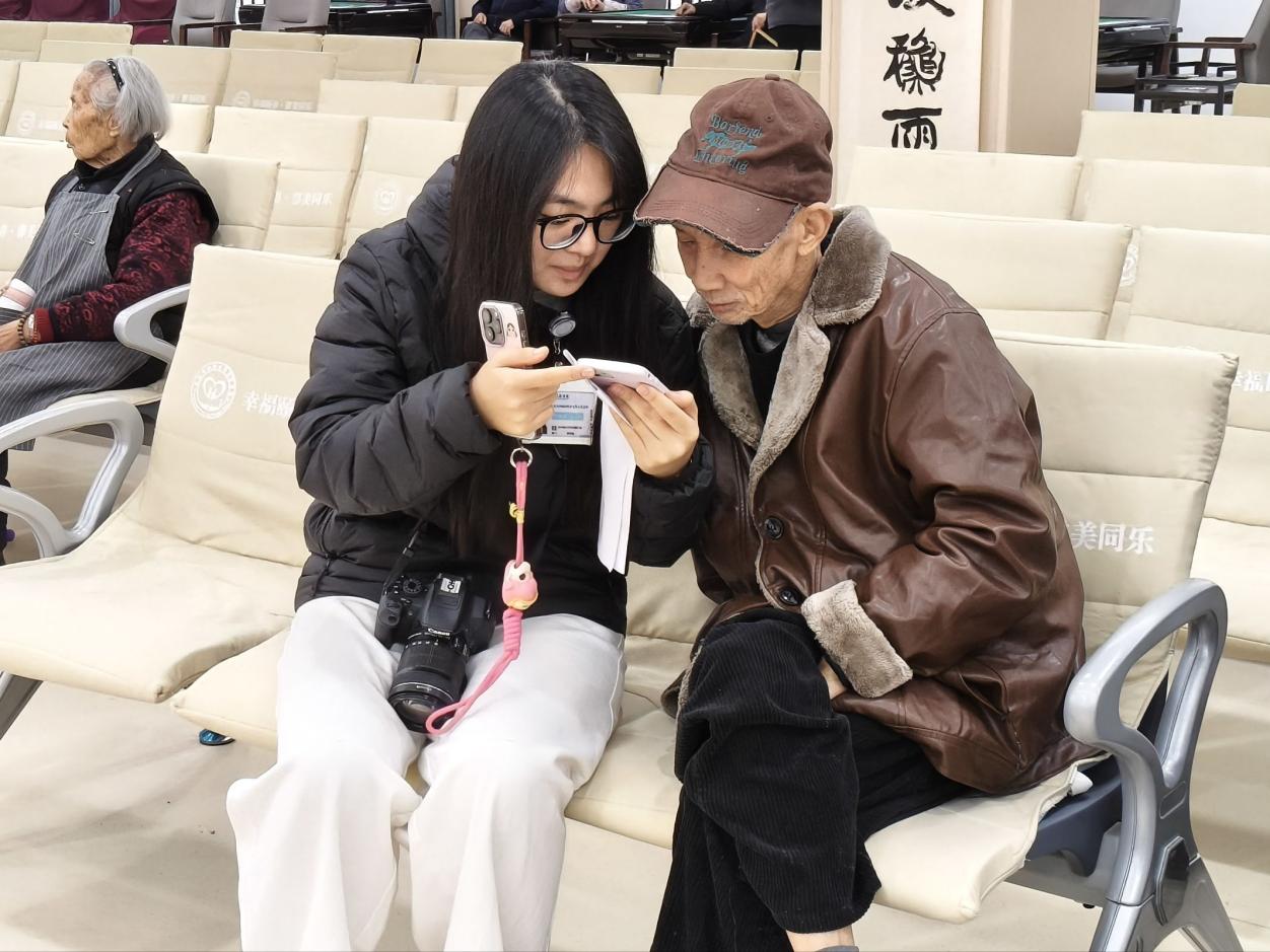 活动以传统习俗互动与文艺表演结合的形式,为老人们送上节日祝福。党支部学生于佳、王皓然、刘执政、韦彦伶、王盈盈、游梦灵表演诗朗诵《这盛世如你所愿》,该节目结合“前辈奋斗”主题,深情回顾了前辈们的奋斗历程,引发了老人们的强烈情感共鸣,不少老人眼含泪光,感慨万分。随后,支部学生为老人演唱了歌曲《紫荆花盛开》,节奏舒缓,旋律优美,并邀请老人们轻轻跟唱,现场气氛温馨而融洽。此外,敬老院老年合唱团也带来了节目《亲爱的朋友们今天来相会》,将现场气氛推向了高潮。期间,学生为老人化妆时,老人们互相欣赏妆容,脸上洋溢着开心的笑容,李奶奶拉着学生的手说:“这胭脂涂得比过年还喜庆!”在协助老人使用电子设备环节,张爷爷在学会视频通话后,立即拨通了在外工作的儿子的视频电话,现场分享这份跨越千里的温情。