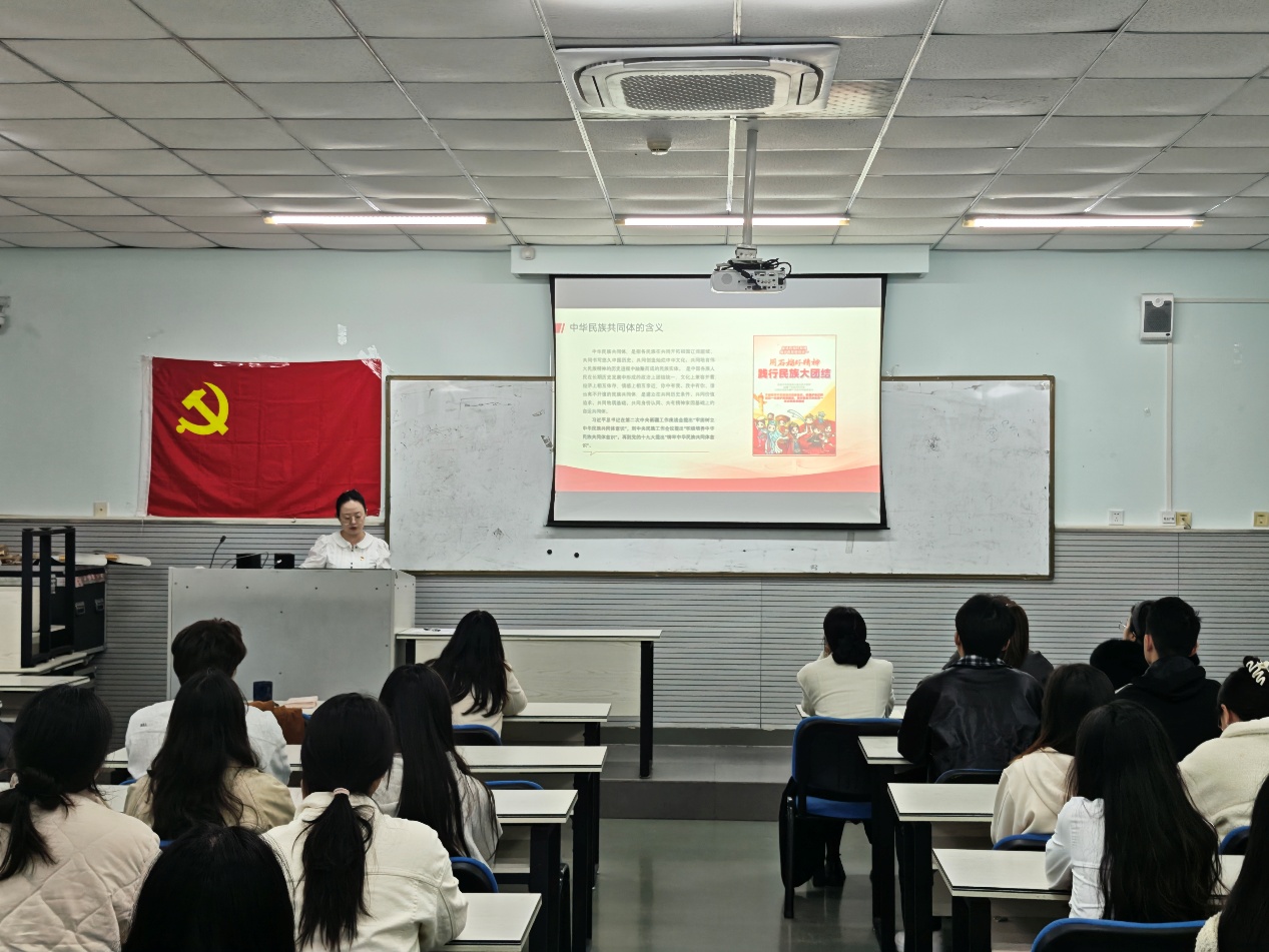 活动伊始,陈思首先从历史维度梳理民族融合的历程:从先秦时期的交融格局,到各个朝代迁徙流动中形成的“大杂居、小聚居”分布,各族群在中华大地上逐渐形成“你中有我、我中有你”的命运共同体。同时,大一统信念与各民族文化的互鉴融通,更让这种共同体意识成为穿越历史的精神纽带。活动中,入党积极分子刘宏兴表示,作为新时代大学生,要牢记党的宗旨,坚定理想信念,密切联系身边同学,用自己的实际行动为铸牢中华民族共同体意识贡献自己的一份力量。