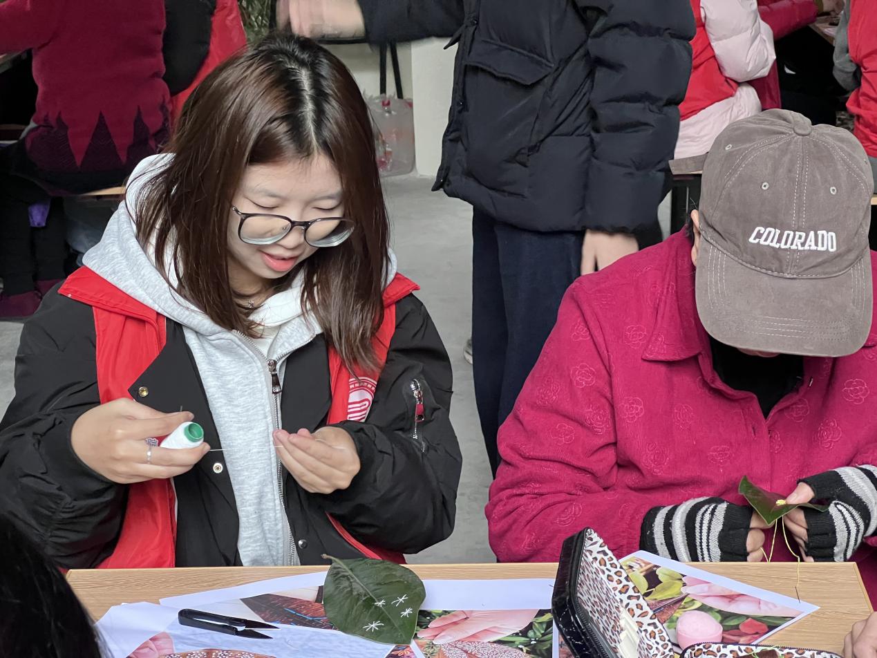 随后,活动进入实操教学环节。所有成员分成若干小组,每组由社区“手艺传承人”全程指导,围绕“树叶手工缝补”展开实践。实操过程中,青年学子们初期面临线团打结、针脚不规整等问题,传承人们结合实操难点,逐一纠正握针姿势、示范针脚走向,从树叶固定方式、缝线路径规划到收尾处理技巧,均进行细致讲解与手把手指导,确保每位同学清晰掌握操作要点。