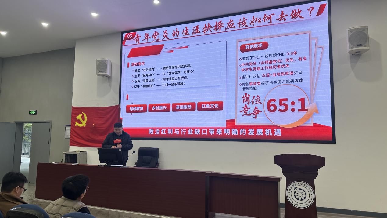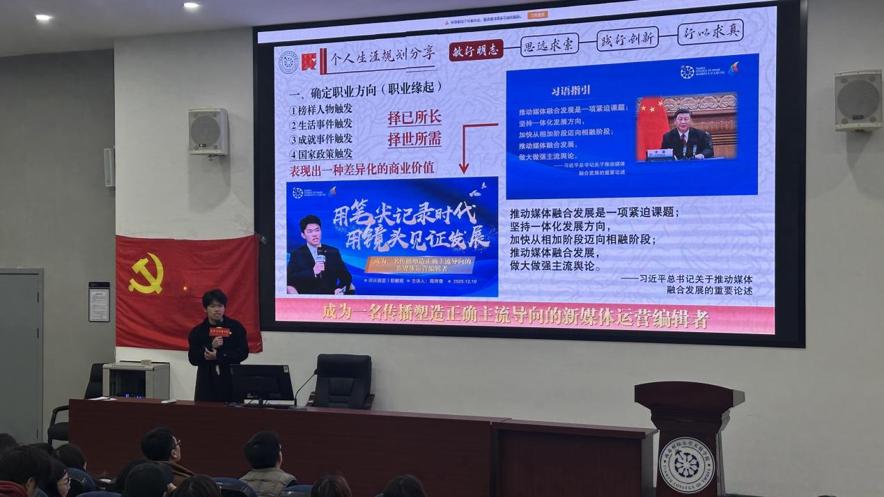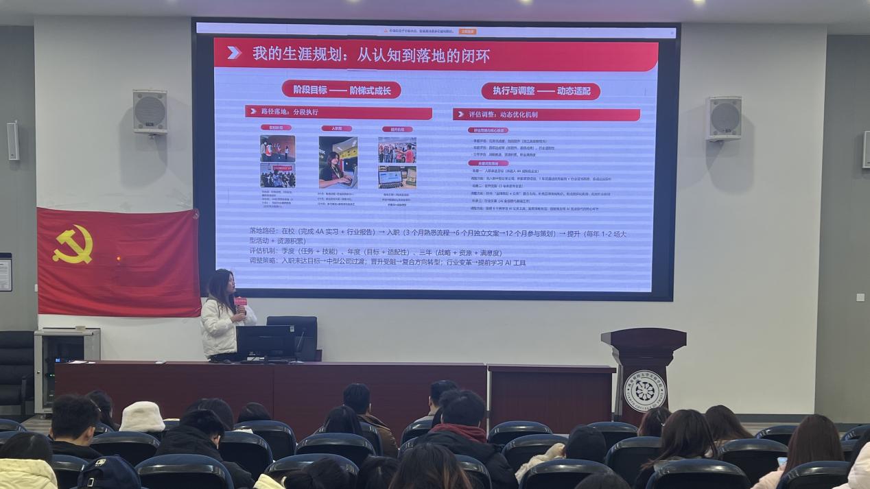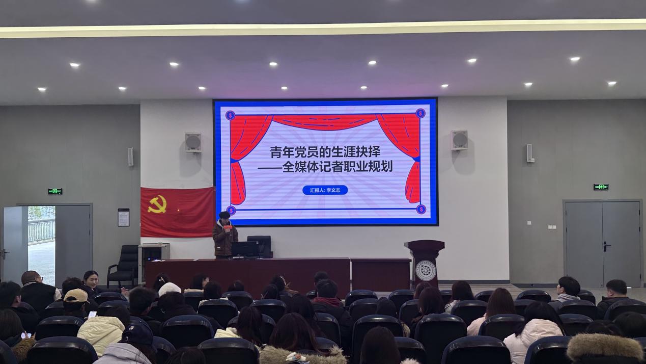 为深入贯彻落实新时代党的建设总要求,切实加强青年党员思想政治引领,助力党员同志明晰职业发展方向,强化责任担当意识,1月5日中午,艺术与传媒学院学生第二党支部在教学楼238教室成功举办“生涯归来话生涯”交流活动——青年党员的生涯抉择主题交流活动。本次活动特别邀请了本次职业生涯规划大赛校赛选手李文志、范津津、张碧海、周沛奇、吴宇轩分享经验,支部党员同志积极参与本次活动。
