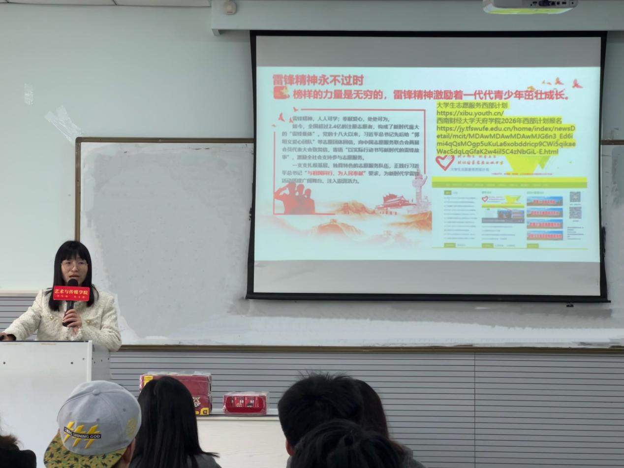 为深入学习贯彻习近平总书记关于弘扬雷锋精神的重要论述,引导青年党员和入党积极分子以实干彰显担当,3月24日中午,学院学生第二党支部在成都校区(东区)L5-238教室开展“传承雷锋精神,践行青春担当”主题党日活动。本次活动由党支部书记苟明娇主持,支部师生党员、入党积极分子参与。