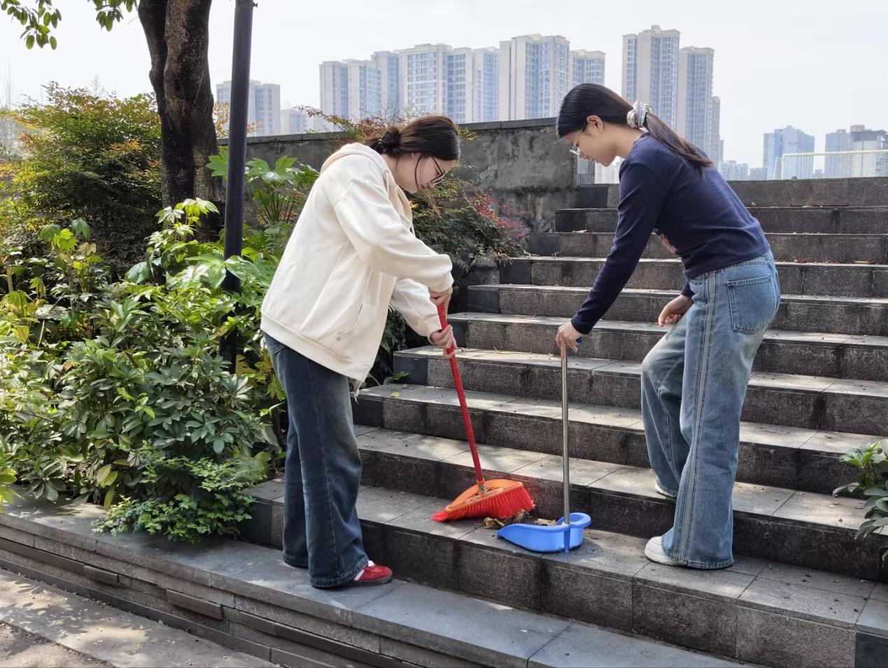 学生党员清理操场楼梯垃圾