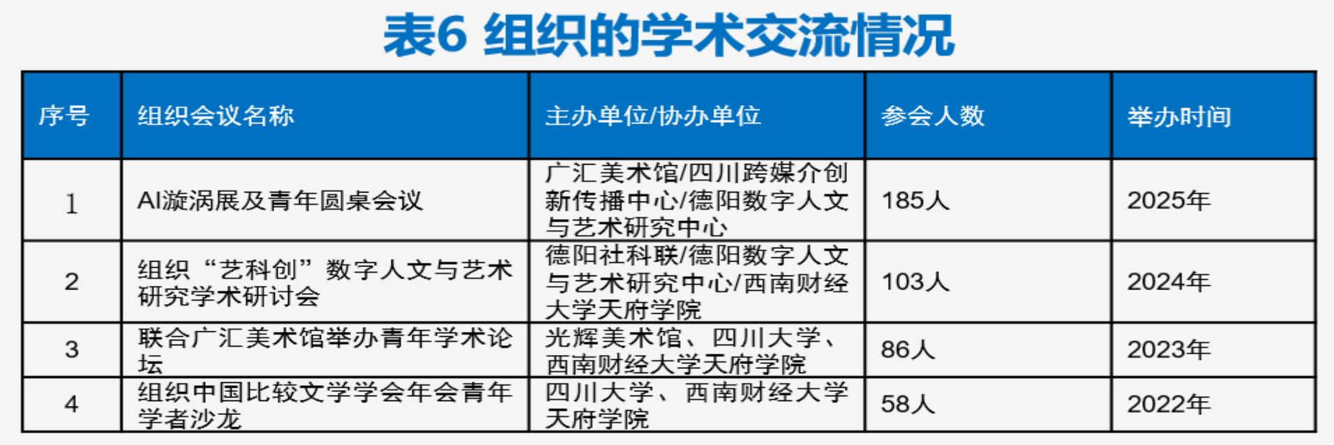在组织学术活动方面,近三年中心团队联合广汇美术馆、德阳社科联举办展览和学术论坛。2024年首次举办 “艺科创” 数字人文与艺术研究学术研讨会,参与人数超100 人,60位学者发言,获10余家媒体报道,广受业界赞誉,团队知名度与影响力显著提升。此外,团队通过 “走出去、请进来”,与10余所国内知名高校及科研基地建立长期合作,与三星堆文化译传中心等开展交流,探索联合研究等合作,搭建学术网络,促进师资成长与学科发展。
